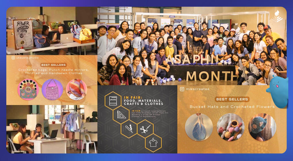 In Fair is ASAPHIL-UP's annual bazaar held at the College of Architecture Building 1 launched on the month of November during ASAPHIL Month. In this event, the organization invites small businesses to take part in the bazaar and open stalls and booths for their respective products. A wide variety of products are sold by the businesses including art materials, food, crafts, homemade goods, and anything more within the interest of the college's constituents. In Fair is open to any small businesses by cooperation with the organization.