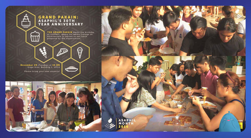 A traditional event held by orgs during recruitment season, the Grand Pakain (also referred to by some as 'GPak') is a potluck or "kainan" hosted by ASAPHIL-UP. It is open to anyone within the university. Almost like a "birthday party," the Grand Pakain marks the official launch of the iconic ASAPHIL Month, ultimately starting the celebration for the organization's foundation and existence throughout the years.